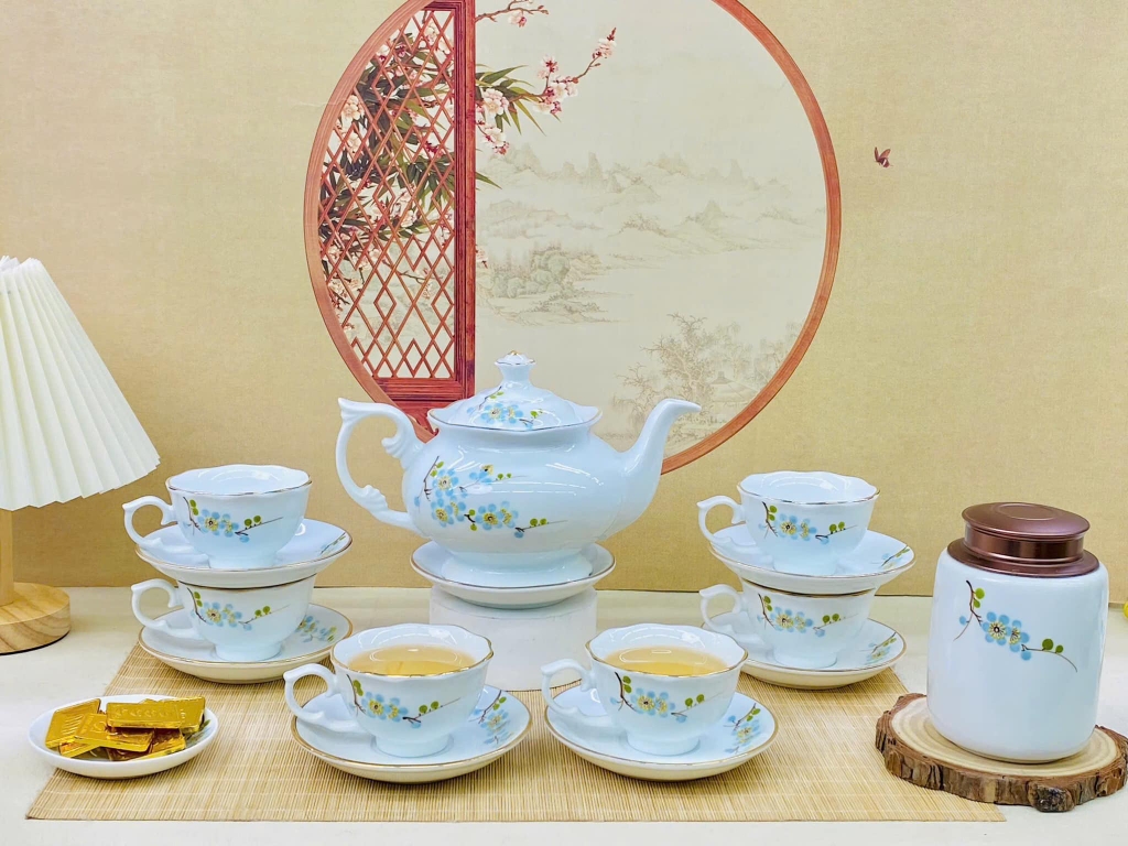 Bộ ấm chén men vân đá vẽ hoa