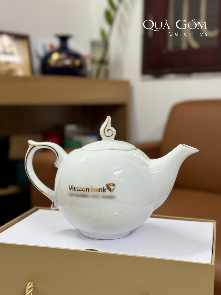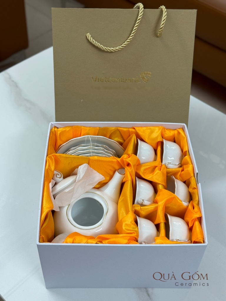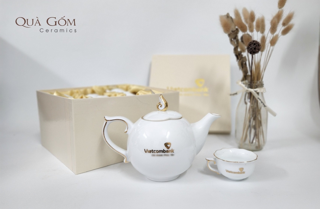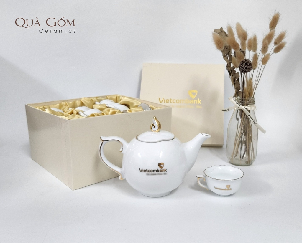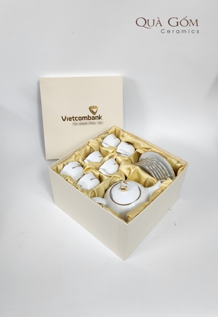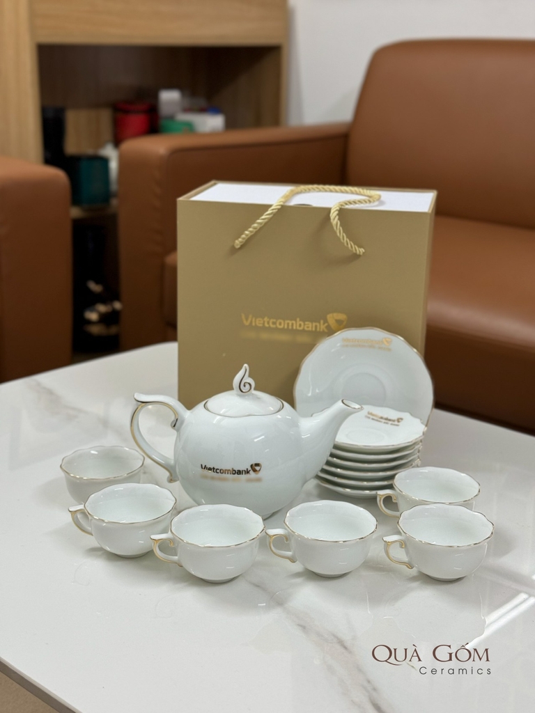 Bộ ấm chén trắng mẫu đơn viền vàng Vietcombank