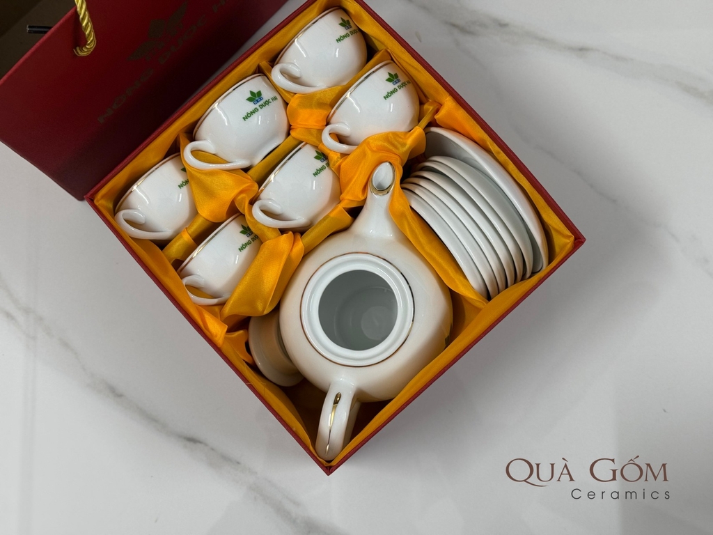 Bộ ấm chén trắng viền vàng Công ty nông dược HAI